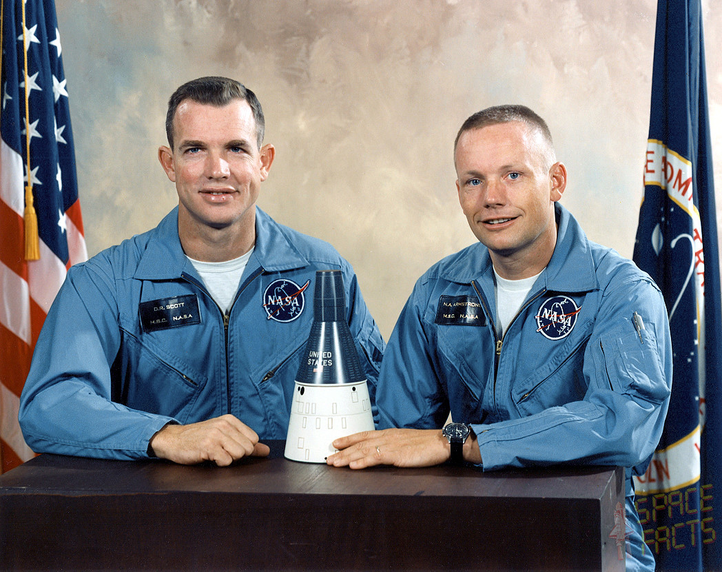 Dave Scott und Neil Armstrong (hier mit seiner Moonwatch) beim Pressetermin für Gemini 8.